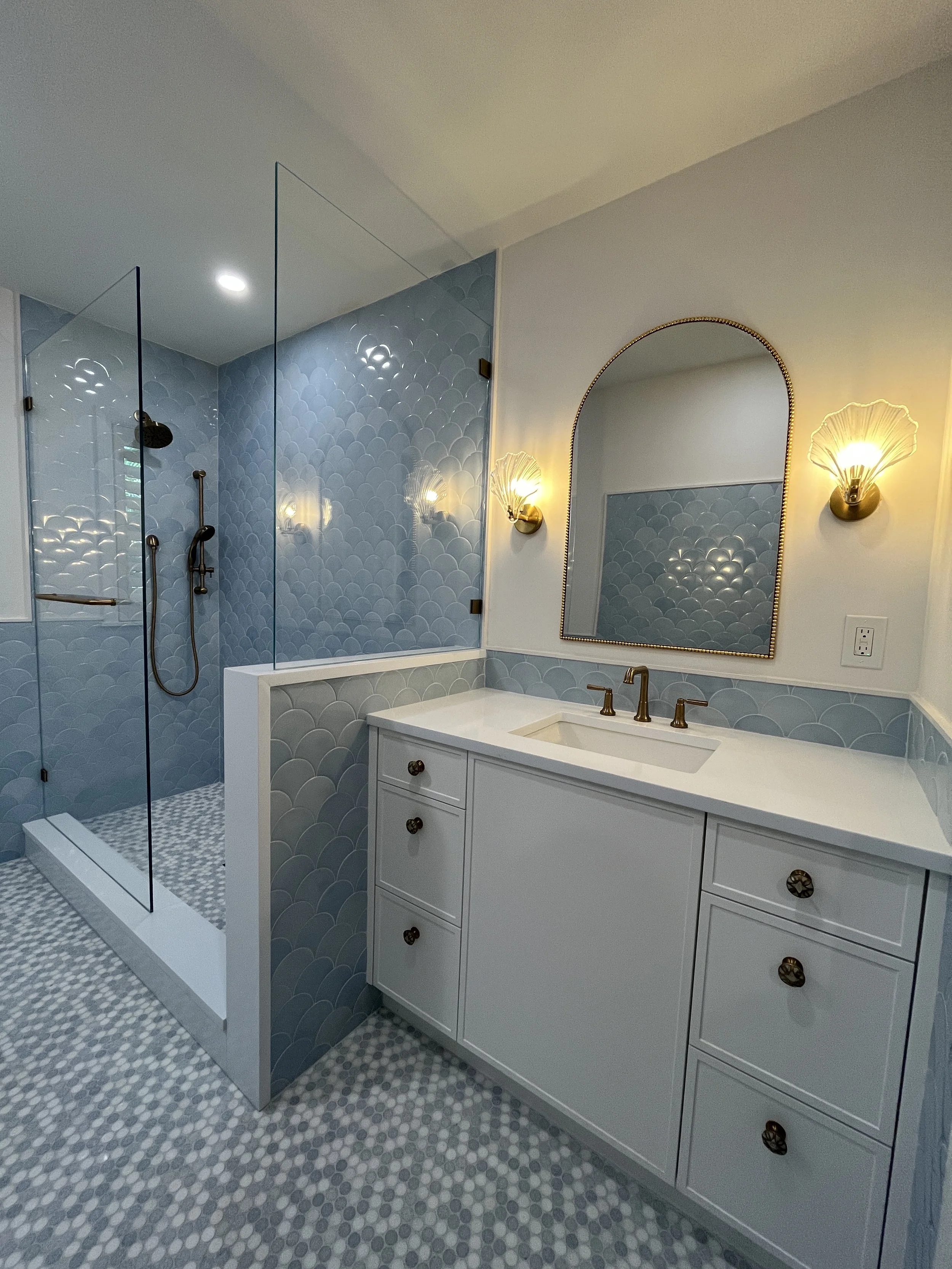Bathroom with a walk-in shower featuring blue scallop-shaped tiles, a white vanity with gold fixtures, and a large mirror flanked by two wall-mounted lights.